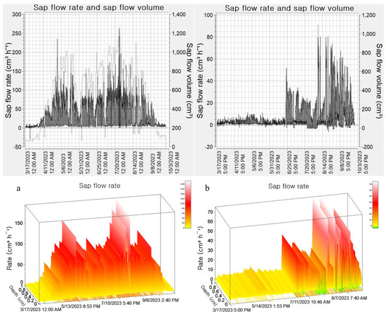 Daily changes in sap flow rate depending on irrigation treatment in container cultivation. (a) Smart automatic irrigation; (b) semi-automatic irrigation. The above figure represents the Raw Heat Pulse Velocity data in a 2D format, while the figure below depicts the 3D graphic representation of the original heat pulse velocity.