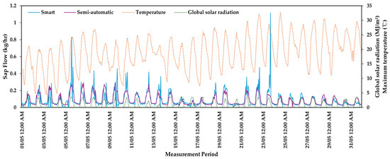 On 21 May, a notable decrease in sap flow was observed across all irrigation treatments, likely due to the low global solar radiation of 1.1 MJ/m2, which was significantly below the monthly average of 3.3 MJ/m2. There were four days in May (5th, 15th, 17th, 21st) when temperatures exceeded 30 °C.