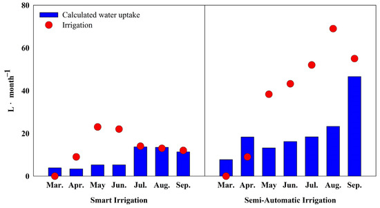 The cumulative monthly transpiration and irrigation volumes for smart automatic irrigation and semi-automatic irrigation methods were analyzed (Figure 10). Sap flow volumes exhibited seasonal variations, changing with environmental conditions such as temperature and relative humidity. During spring (March–May), sap flow volumes were relatively low for both irrigation methods, aligning with the period of generally lower temperatures and reduced plant water demand. In the smart automatic irrigation method, the sap flow volume was 5.3 L in April, whereas the semi-automatic method recorded a particularly high flow of 18.3 L in May.