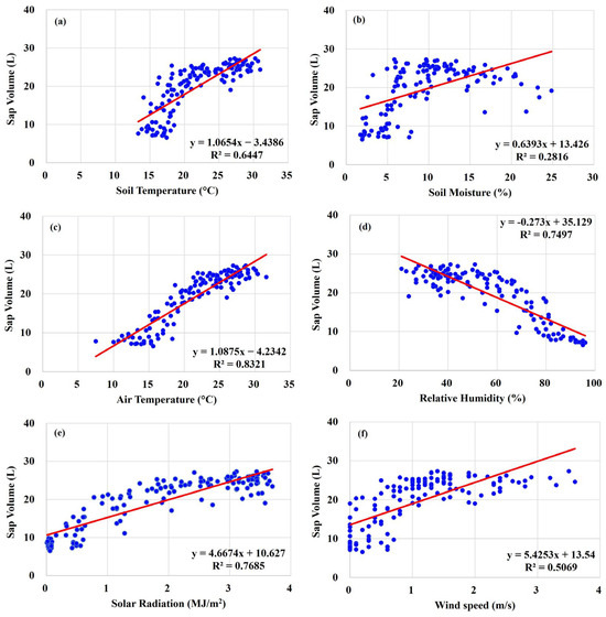 Relationship between sap flow volume in Prunus × yedoensis and weather parameters. (a) Sap flow versus soil temperature; (b) sap flow versus soil moisture; (c) sap flow versus air temperature; (d) sap flow versus relative humidity; (e) sap flow versus solar radiation; (f) sap flow versus wind speed.