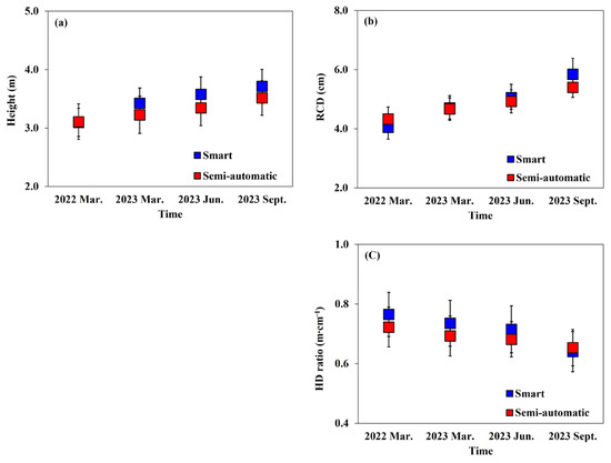 The growth and root collar diameter growth of Prunus × yedoensis trees varied significantly with different irrigation treatments (Table 3, Figure 12). Height growth (p < 0.01) and relative growth rate (p < 0.001) were higher in the smart automatic irrigation system. Similarly, root collar diameter growth (p < 0.001) and relative growth rate (p < 0.001) also tended to be higher in the same treatment group. The height-to-diameter ratio (H/D ratio) ranged from 0.64 to 0.65 m·cm−1 across all treatments, showing no significant differences between the irrigation methods