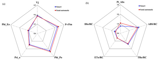 Parameters indicating changes in energy flow per reaction center, such as ABS/RC, TRo/RC, and DIo/RC, increased in the semi-automatic treatment, while ETo/RC tended to decrease. The increase in ABS/RC suggests more reaction centers in a reduced state, indicating partial inactivation [50]. The increases in TRo/RC and DIo/RC imply that energy captured and released as heat from each reaction center has risen as overall active reaction center numbers have decreased. Particularly, the increase in DIo/RC is closely related to photoinhibition, understood as a protective mechanism against excess energy influx under water stress [51]. The decrease in ETo/RC indicates inhibited electron transport to reduce P700 in Photosystem I after QA reduction.