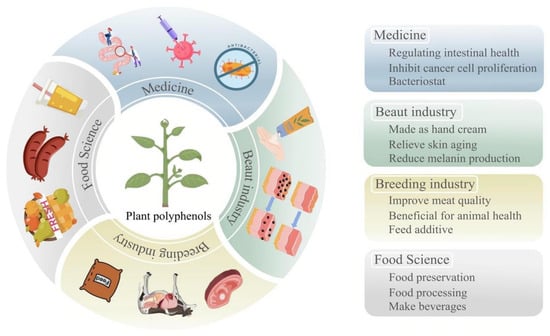 The antioxidant and antibacterial properties, along with various other biological activities of PPs, have increasingly positioned them as a focal point of research within the livestock industry. These compounds are commonly utilized as feed additives, contributing to enhanced animal growth and improved production performance through their anti-inflammatory and intestinal protective functions. For instance, the incorporation of 80 g·d−1 of bamboo leaf polyphenol extract into the diets of beef cattle has been shown to optimize gut microbiota composition and alter ruminal fermentation characteristics. This modification subsequently enhances the metabolic utilization of feed and the digestibility of fiber components, leading to increased daily weight gain in beef cattle [73]. Moreover, the inclusion of Eucommia ulmoides Oliv. leaf polyphenol extract in pig diets significantly increases muscle fiber density while concurrently reducing muscle fiber diameter, thereby improving muscle fiber composition and enhancing meat quality [74].