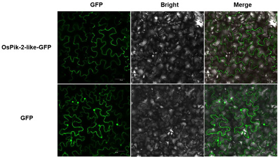 To elucidate the subcellular localization of OsPik-2-like, we generated the construct 35S::OsPik-2-like-EGFP (the enhanced green fluorescent protein was fused to OsPik-2-like), which was driven by a CaMV 35S promoter. Then, the construct was transiently expressed in Nicotiana benthamiana leaves using Agrobacterium tumefaciens-mediated transformation. As shown in Figure 2, compared with the wide distribution of the control EGFP, the OsPik-2-like-EGFP mainly localized to plasma membranes of tobacco leaf cells, indicating that OsPik-2-like was a plasma membrane (PM)-localized CNL protein.