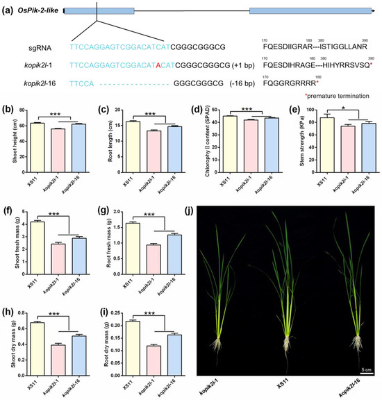 We investigated the effect of knocking out OsPik-2-like on plant growth. Knocking out OsPik-2-like reduced shoot height (by 11.75% in kopik2l-1 and 1.84% in kopik2l-16, compared with WT plants), root length (by 18.18% and 9.91%), chlorophyll content in leaves (by 7.15% and 3.47%), stem strength (by 15.34% and 10.7%), shoot fresh mass (by 42.24% and 31.21%) and shoot dry mass (by 42.17% and 25.14%), and root fresh mass (by 42.47% and 22.99%) and root dry mass (by 45.28% and 25.01%) of 30-day-old plants (Figure 4b–i; Table S2). These data suggest that OsPik-2-like positively regulated rice growth.