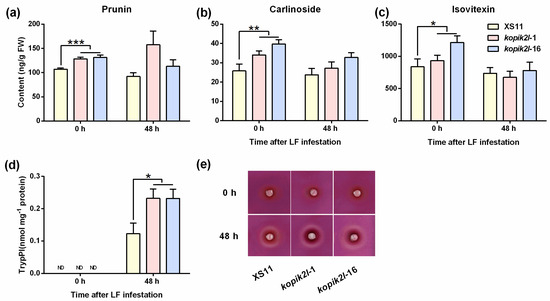 Flavonoid levels and TrypPI activity in the leaves of WT plants and ko-pik2l lines. Mean concentrations (+SE, n = 5~6) of prunin (a), carlinoside (b), isovitexin (c), and mean TrypPI activity (+SE, n = 7) (d) in WT plants and ko-pik2l lines that were individually infested by a 3rd-instar LF larva on the first fully expanded leaf for 0 h or 48 h. Asterisks indicate significant differences in ko-pik2l lines compared with WT plants evaluated by Bayesian analysis of variance (* p < 0.05, ** p < 0.01 and *** p < 0.001). (e) Representative pictures of TrypPI after different treatments measured by radial diffusion assay.