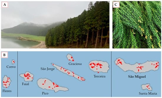 Azorean Cryptomeria japonica: (A) woodland; (B) current distribution (shown in red) across the three island groups of the Azores archipelago: western (Flores and Corvo), central (Faial, Pico, São Jorge, Graciosa, and Terceira), and eastern (São Miguel and Santa Maria) [22]; and (C) fresh foliage, the plant part utilized in this study, after removal of attached cones.