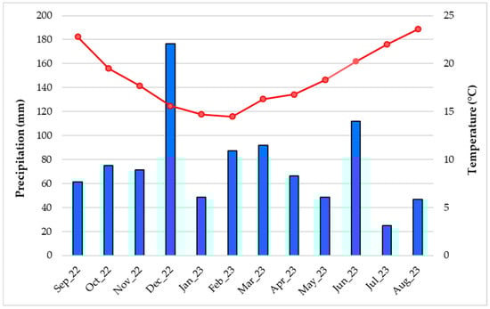 Means of the air temperature and precipitation levels by month in São Miguel Island, Azores, from September 2022 to August 2023 [50].