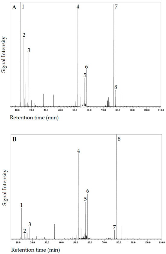Total ion current (TIC) chromatogram on a ZB–5MSPlus capillary column of the essential oil extracted via hydrodistillation from fresh Azorean Cryptomeria japonica foliage collected in one site in São Miguel Island (A) during autumn; (B) during spring. Legend: 1—α-Pinene; 2—Sabinene; 3—Limonene; 4—Elemol; 5—γ-Eudesmol; 6—β + α-Eudesmol; 7—Phyllocladene; 8—Kaur-16-ene.