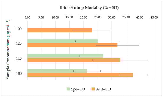 The potential toxicity of the studied EOs samples, estimated through a BSLA assay, is shown in Figure 4. The mortality rates varied from 0 to 27 ± 8.37% for Spr–EO and from 19 ± 7.58 to 37.5 ± 5% for Aut–EO, at a concentration range of 120–180 μg·mL−1.