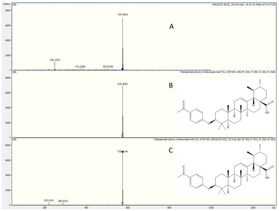 Pentacyclic triterpenoid’s medicinal values have been increasingly recognized in recent years [4], thus being introduced as a pharmaceutical for the treatment of various ailments [4,6,7,8,9,10,11,12,13,14,15,16,17,18,19]. Considering the pharmacological properties of triterpenoids, screening plant extracts and products to identify and characterize them is extremely important. Nowadays, the most used technology for phytochemical analysis is liquid chromatography–high-resolution mass spectrometry (LC-HR-MS).