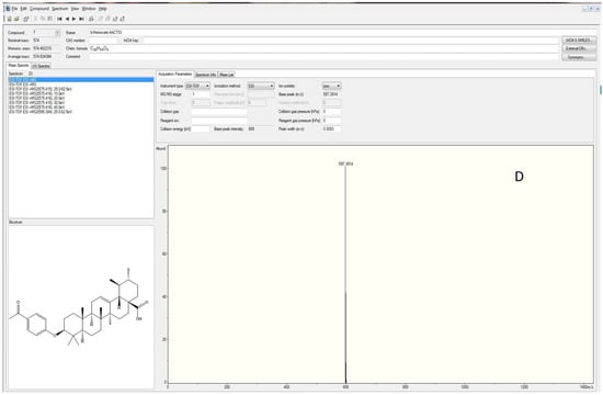 Using Bruker Compass LibraryEditor (4.4), both [M + H]+ and [M + Na]+ mass spectral data, as well as their additional metadata for all the analyzed standards, were assembled into a spectral database. A reference standard triterpenoid entry in the developed spectral library is shown in Figure 2D. This spectral library will be especially helpful for comparing compounds with good peak intensities of their sodium adducts during the identification process.