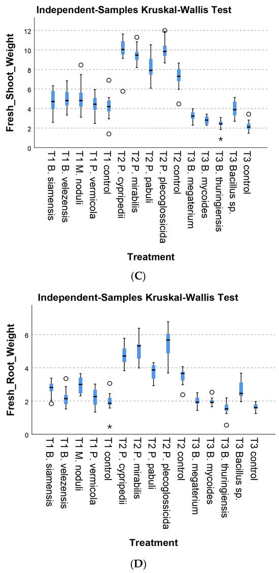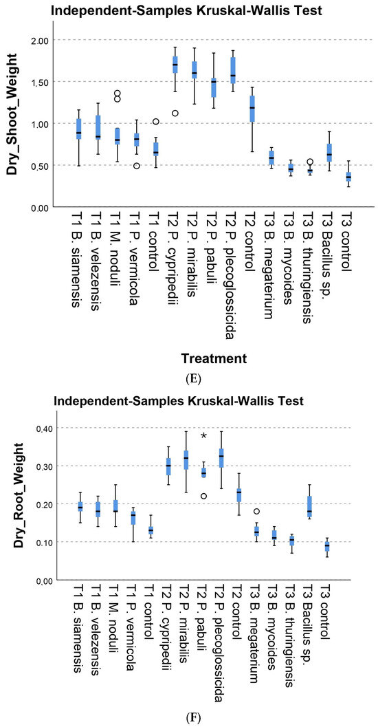 Kruskal–Wallis tests for the six morphological variables studied. Note the clear difference between the three culture batches. (A) Shoot length (cm). (B) Root length (cm). (C) Fresh shoot mass (g). (D) Fresh root mass (g). (E) Dry shoot mass (g). (F) Dry shoot mass (g). Error bars represent standard deviation. The circle refers to outliers. The “*” refers to extreme outliers.