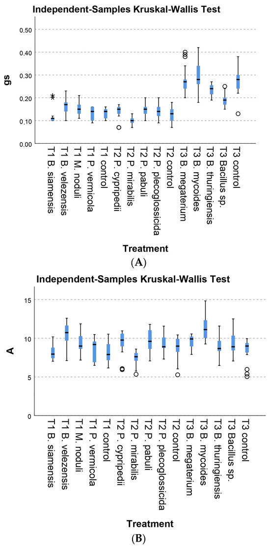 Kruskal–Wallis tests for the two physiological parameters studied. (A) Stomatal conductance. (B) Photosynthesis rate. Error bars represent standard deviation. The circle refers to outliers. The “*” refers to extreme outliers.