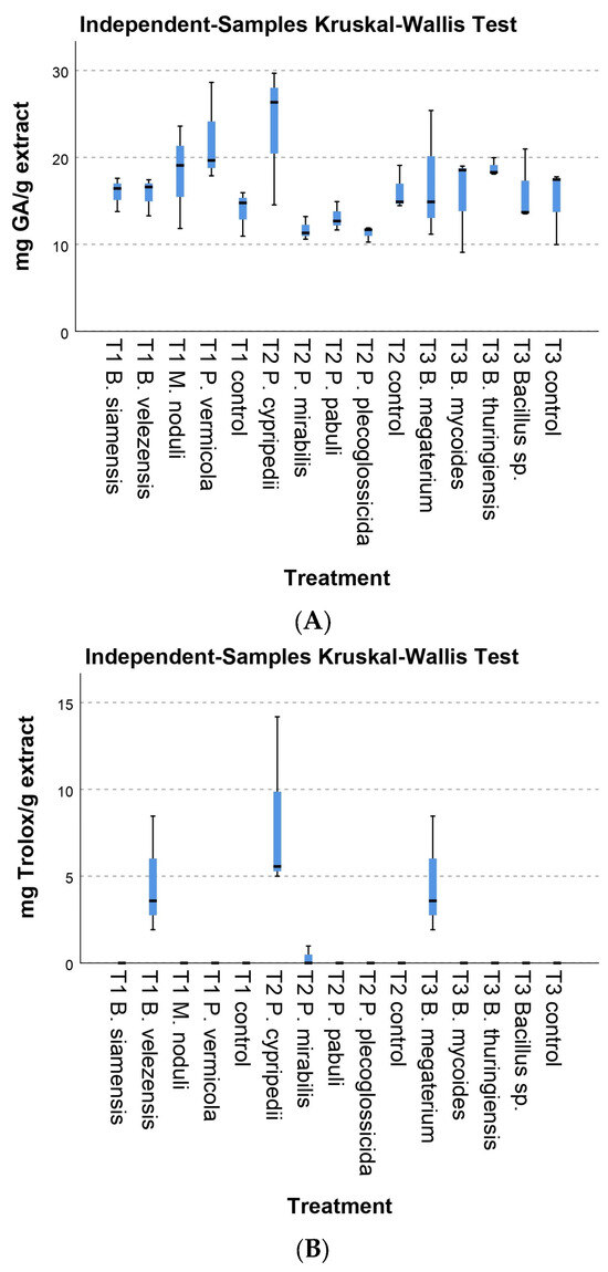 Kruskal–Wallis test for phenol and antioxidant content per gram of extract. (A) mg g−1 of Galic acid—phenol. (B) mg g−1 of Trolox—antioxidant. Error bars represent standard deviation.