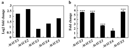 Induction of AtAUEs by ABA treatment. (a) AtAUEs are identified as ABA-responsive genes based on RNA-seq analysis. Log2 fold changes were calculated by comparing expression levels in ABA-treated versus mock-treated seedlings. (b) Fold changes in AtAUEs in response to ABA. Eight-day-old Col seedlings were treated with 50 mM ABA or methanol (mock) for 4 h. RNA was isolated, and cDNA was synthesized for quantitative Real-Time PCR (qRT-PCR) analysis. ACT2 was used as the internal control. Data represent mean ± SD of three biological replicates. Significantly different from that of the mock-treated seedlings (* p < 0.05, *** p < 0.001).