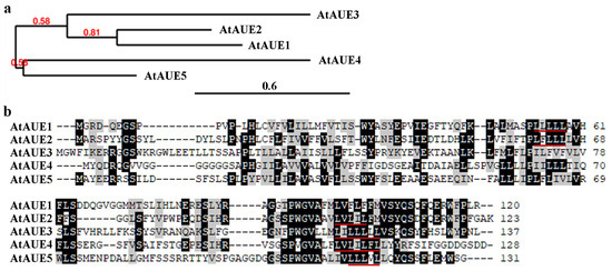 Phylogenetic analysis and amino acid sequence alignment of AtAUEs. (a) Phylogenetic analysis of AtAUEs was conducted using full-length amino acid sequences on the Phylogeny website (www.phylogeny.fr, accessed on 30 June 2024) with default settings in “One Click” mode. Branch support values are shown above the branches. (b) Amino acid sequence alignment of AtAUEs was performed using BioEdit. Identical amino acids are shaded in black, similar amino acids in gray, and LxLxL motifs are indicated by red underlines.