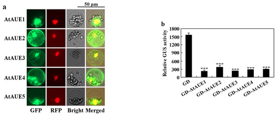We examined the subcellular localization of AtAUEs using Arabidopsis protoplast transfection assays. Constructs of GFP-AtAUEs were generated and co-transfected with an NLS-RFP nuclear indicator plasmid into isolated Arabidopsis protoplasts [42]. After 22 h of incubation, GFP and RFP fluorescence was analyzed using a fluorescence microscope. As depicted in Figure 3a, the overlap of GFP fluorescence with RFP suggests that AtAUEs were predominantly localized within the nucleus, though some fluorescence was also detected in other cellular regions, including the cell membranes.