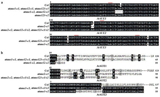 Generation of ataue1, ataue2, ataue3 single mutants, ataue12 double mutants, and ataue123 triple mutants. (a) DNA sequence alignment of AtAUE1, AtAUE2, and AtAUE3 in Col wild-type and the gene-edited ataue1, ataue2, and ataue3 single mutants, as well as ataue12 double and ataue123 triple mutants. Numbers above the sequences indicate nucleotide positions relative to the start codon. Red lines indicate PAM sites. (b) Amino acid sequence alignment of AtAUE1, AtAUE2, and AtAUE3 in Col wild-type and the gene-edited mutants. The DNA sequences were analyzed for open reading frames (ORF) using ORFfinder (https://www.ncbi.nlm.nih.gov/orffinder/, accessed on 11 October 2017), and predicted amino acid sequences were aligned with those in Col wild-type. Numbers above the sequences indicate amino acid positions relative to the initiating methionine, and numbers at the end indicate total amino acid counts for the AtAUE proteins.