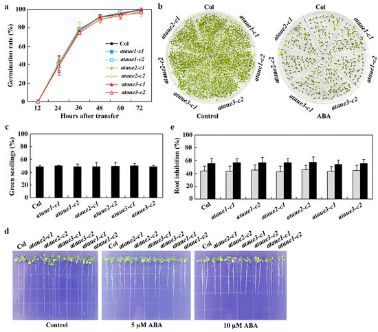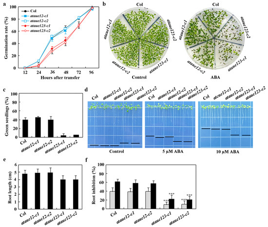 In seed germination assays, the ataue12 double mutants exhibited a similar ABA response to the Col wild-type, while significant reductions in germination were noted for seeds of the ataue123 triple mutants (Figure 6a). A comparable result was observed in the cotyledon greening assays, where the ataue12 double mutants and the Col wild-type produced a similar number of green seedlings in the presence of ABA, whereas the number of green seedlings in the ataue123 triple mutants was greatly diminished (Figure 6b). Quantitative results indicated that both the Col wild-type and the ataue12 double mutants had approximately a 40% green seedling rate in the presence of ABA, while the ataue123 triple mutants showed only about a 5% green seedling rate (Figure 6c).