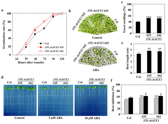 In seed germination tests, the germination rate of 35S:AtAUE1 plants was higher than that of Col wild-type in the presence of ABA (Figure 7a). In cotyledon greening assays, 35S:AtAUE1 plants produced more green seedlings than Col wild-type when ABA was present (Figure 7b), with approximately 40% green seedlings for Col wild-type and about 50% for 35S:AtAUE1 (Figure 7c).