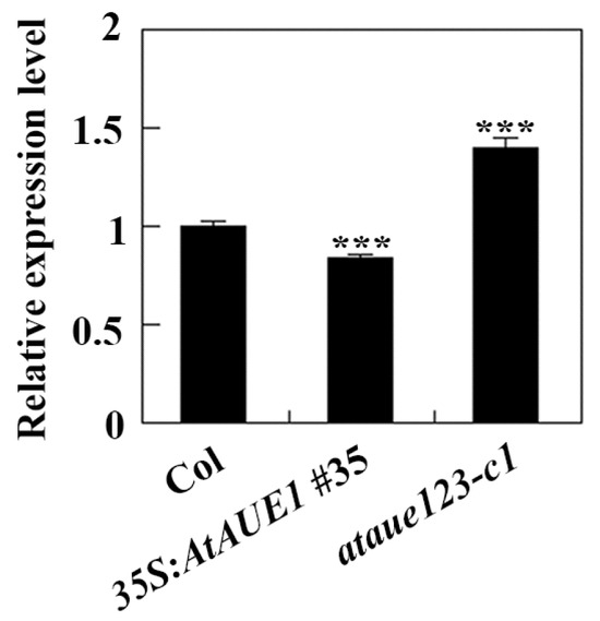 Expression of ABI5 in Col wild-type, 35S:AtAUE1 transgenic plants, and ataue123 triple mutants. Total RNA was isolated from ten-day-old seedlings of Col wild-type, 35S:AtAUE1 transgenic plants, and ataue123 triple mutants. cDNA was synthesized and used for qRT-PCR to assess ABI5 expression, with ACT2 serving as an internal control. ABI5 expression levels in Col wild-type seedlings were normalized to 1, and relative expression levels in 35S:AtAUE1 and ataue123 triple mutants were calculated accordingly. Data are presented as mean ± SD of three technical replicates. Significantly different from that of the Col wild-type (*** p < 0.001).
