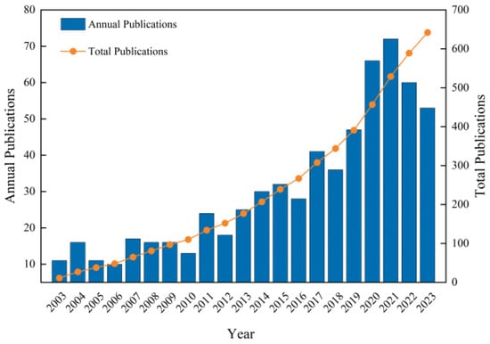 The online literature was searched through the Science Citation Index Expanded of the Web of Science Core Collection (WoS, Clarivate Analytics) on 31 December 2023. This database was selected because of its high quality and rich literature coverage, and further, it was highly suitable for mainstream bibliometric software [19]. The retrieval formula for this subject was TS = (apoplastic barriers OR Casparian strip OR Casparian band OR suberin lamellae). We manually excluded publications that did not fit the purpose of this study, such as those investigating the CS response of plant stems to stress. Overall, we downloaded 642 publications, including 512 research articles, 89 reviews, and 41 editorials.
