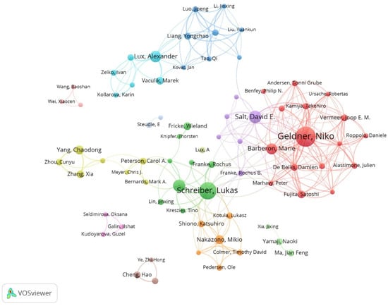The University of Bonn had the maximum number of publications, followed by the University of Lausanne and the Chinese Academy of Sciences (Table 3). At the same time, these institutions have relatively rich collaborative networks, suggesting their frequent collaboration on a global scale (Figure 3). Niko Geldner, Lukas Schreiber, and Marie Barberon are three authors with a maximum number of publications (more than 15 publications each) (Table 4). Similarly, these scholars collaborated more with other researchers, likely due to their stronger academic reputation and higher authority (Figure 4). Overall, this information may assist scholars in the field in finding authoritative collaborators and promoting scholarly exchange.
