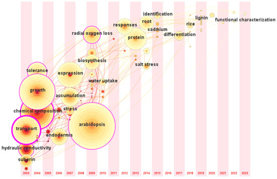 Time zone map of the research on apoplastic barriers. The position of the circle is the time of the first appearance of the keyword; the larger circle indicates that the keyword appears more often.