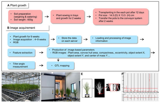 For the identification of QTL associated with tiller angle, 162 recombinant inbred lines (MGRILs) derived from the cross between ‘Milyang23’ (Tongil type) and ‘Giho’ (Japonica type) were used as plant materials. MGRILs is a population that was first crossed in 1988 and fixed for more than F25. Seeds were disinfected with a fungicide, soaked at 28°C for 4 days, and grown in a greenhouse for 2 weeks. Pots (15 cm in diameter) were filled with 600 g of soil and saturated with water for 3 days. Seedlings were transplanted into the pots and then transported to a conveyor system. Environmental conditions in the greenhouse were maintained under a photoperiod of 14 h light/10 h dark, humidity of 50%, and light intensity of 1000 µmol/m2. Each line was planted and evaluated in six replicates.