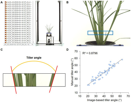 Program for automatic measurement of the tiller angle of rice. (A) RGB images of rice plants stored in the 3D scanalyzer imaging system server. (B) Measurement area recognition. The recognized area is marked with a blue rectangle. (C) Angle of tiller as measured by the program. (D) Correlation analysis between image-based tiller angle and manually measured tiller angle.