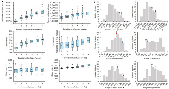 Analysis of the distribution of image-based parameters in MGRIL population. (A) Box-and-whisker plot of image-based parameters across development stage. (B) Frequency distribution of image-based parameters 9 weeks after sowing. M, Milyang23; G, Giho.
