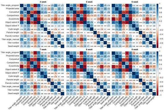 In the correlation analysis between tiller angle, image-based parameters, and manually measured major agronomic traits, the tiller angle measured by the program showed a significant correlation with the manually measured tiller angle (Figure 6). The correlation coefficient (r-value) increased from 0.54 at 4W to 0.75 at 9W, and gradually increased with the development stage. Among the image-based parameters, eccentricity (r-value: −0.91–−0.8), object extent X (0.52–0.76), and convex hull area (0.43–0.73) had significantly strong correlations with the tiller angle, and eccentricity showed the highest negative correlation in all development stages. Projected area (0.29–0.5), compactness (−0.42–−0.09), panicle number (0.25–0.31), tiller number (0.21–0.35), and seed weight (0.19–0.28) showed weak correlations with tiller angle. Object extent Y showed almost no correlation, and culm length and panicle length showed no correlation.