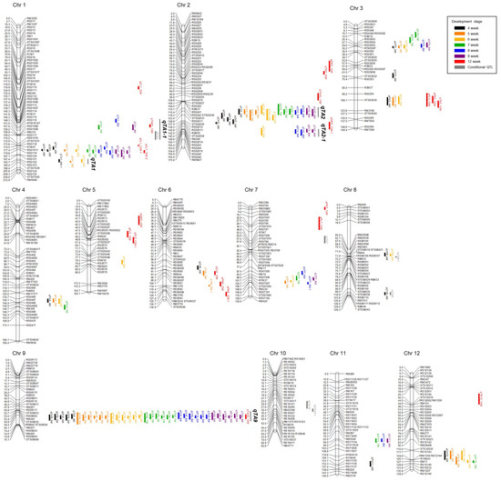 Chromosomal locations of QTL associated with tiller angle and 12 agronomic traits. A total of 136 unconditional QTLs and 6 conditional QTLs were detected in Milyang23/Giho RIL population. The bars representing QTL were created by the confidence interval of the QTL and were represented in different colors for each development stage.
