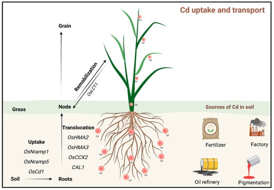 Cadmium transference into plant tissues from soil can be detrimental, which can cause significant harm to various plant species []. Plant physiology involves a range of processes vital to plant health, such as reproductive functions, growth, metabolism, and overall vitality. Cd acts as a hazardous contaminant that negatively impacts these physiological processes []. Even at a low concentration, Cd is highly toxic to plants when administered in vivo, damaging cell membranes, disrupting mitochondrial functions, and inhibiting respiration, among other harmful effects []. When plants accumulate Cd concentrations of 5–10 mg per leaf of dry weight, Cd could induce lethal effects on the plants []. The growth of Merwilla plumbea plants was impacted by Cd stress, with a decrease in weight observed as Cd levels increased []. Similarly, Radix isatidis thrives under low Cd concentrations but faces growth suppression at higher levels []. Ref. [] observed that Cd significantly reduces the biomass of Phyllanthus amarus and negatively impacts other plants by causing root discoloration and distortion. These changes inhibit growth, resulting in dwarf seedlings, damaged roots, and ultimately decreased yields. The harmful effects of Cd extend to several physiological functions, including osmoregulation, photosynthesis, and the antioxidant system [,,,]. Cd disrupts the photosynthetic apparatus, reduces photosynthetic rates, and inhibits pigment production []. Accumulation of Cd in vegetative organs hinders plant growth, leading to reductions in shoot and root length and overall weight []. Figure 1 shows how Cd accumulates in roots but can translocate to aerial parts like leaves, stems, and even seeds by different transporters.
