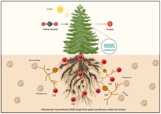 Mycorrhization stimulates the synthesis of phytochelatins, which are important for detoxifying heavy metals, within plant cells. By binding to metal ions, phytochelatins help mitigate the toxic effects of heavy metals and assist in their storage and transport within the plant []. These peptides have a high affinity for toxic metals and hence promote their detoxification in vacuoles. Furthermore, mycorrhizal symbiosis enhances the expression of root metal transporters, thereby influencing the uptake and translocation of heavy metals within plants. This increased expression can improve the plant’s ability to manage and tolerate metal stress []. AMF additionally promote plant nutrient uptake, specifically of phosphorus (P) and trace elements that can compete against heavy metals for available sites [,]. Therefore, by enhancing nutrition and strength in plants, AMF help relieve the harmful effects of heavy metals, including Cd toxicity, on plant growth and development []. Consequently, the symbiotic relationship between plants and AMF enhances soil structure and fertility, [] thereby promoting healthy ecosystems under Cd stress [].