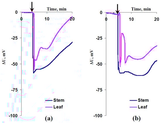 - Evans, M.J.; Morris, R.J. Chemical agents transported by xylem mass flow propagate variation potentials. Plant J. 2017, 91, 1029–1037. [Google Scholar] [CrossRef] [PubMed]