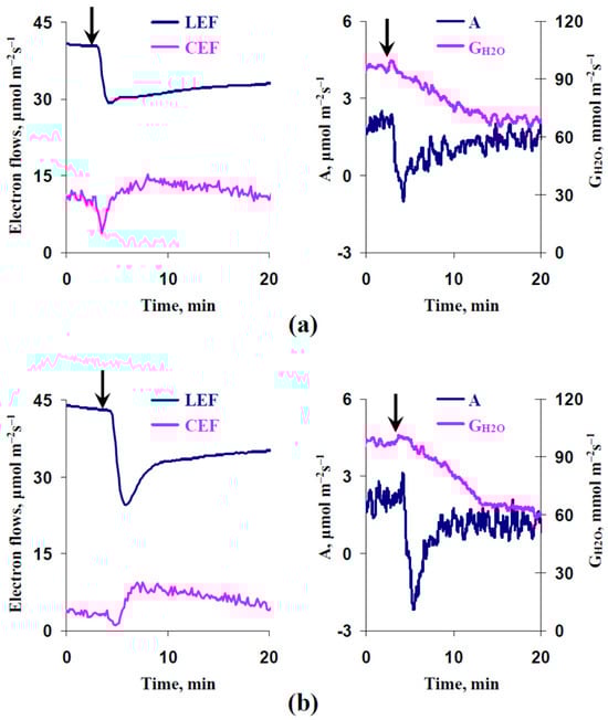 - Sukhov, V.; Surova, L.; Sherstneva, O.; Katicheva, L.; Vodeneev, V. Variation potential influence on photosynthetic cyclic electron flow in pea. Front. Plant Sci. 2015, 5, 766. [Google Scholar] [CrossRef]