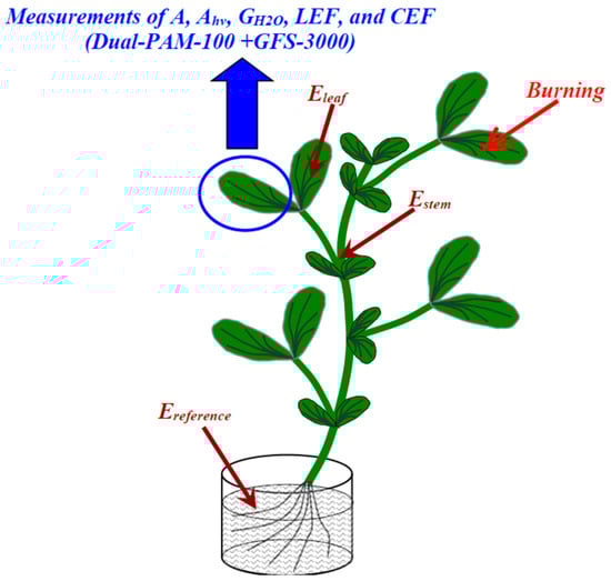 - Gallé, A.; Lautner, S.; Flexas, J.; Ribas-Carbo, M.; Hanson, D.; Roesgen, J.; Fromm, J. Photosynthetic responses of soybean (Glycine max L.) to heat-induced electrical signalling are predominantly governed by modifications of mesophyll conductance for CO2. Plant Cell Environ. 2013, 36, 542–552. [Google Scholar] [CrossRef]