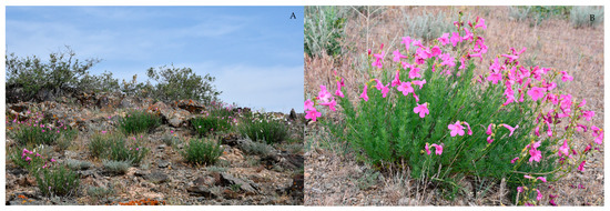 I. semiretschenskia (Figure 1A,B) is a xerophytic dwarf semishrub up to 70 cm high, 30–35 cm on average, with numerous woody, leafy stems at the base and leaves pinnately dissected into narrow, linear lobes. The flowers are regular on the top of the shoots. The corolla is bright pink, tubular-funnel-shaped, and 35–42 mm long with a 20–30 mm long tube and a 5–8 mm long bend. It has five rounded lobes, four stamens and fruit, with a capsule 30–40 mm long and 15 mm wide, with four to six winged, serrated ribs. Its ovoid seeds are 6–7 mm long. It is distributed in the slopes of the Shu-Ile low mountains, the Anarkhai upland, Aiderke, the Kopalysai tracts, and the Sarybulak and Aschisu interfluves. The plant blooms in May, with fruiting in June–July. It is propagated by seeds, in culture by dividing the bush and green cuttings [1,5,6,7,8,9,10,11].