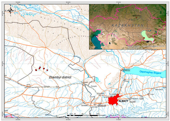 The studies were carried out in the Shu-Ile low mountains in Kazakhstan. The research area is located within the Zhambyl district of the Almaty region (Figure 2).