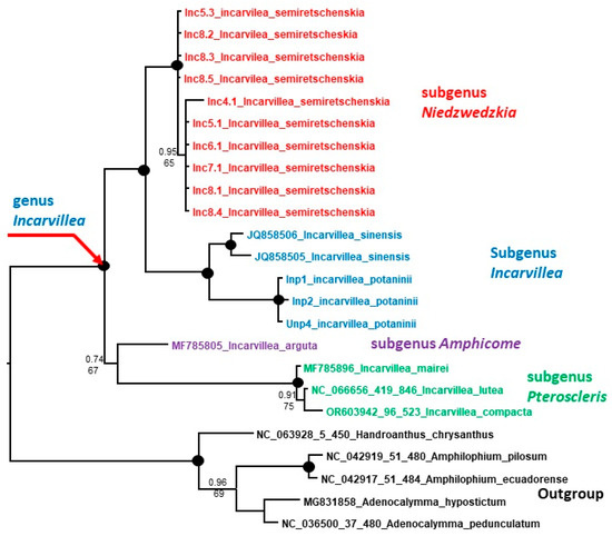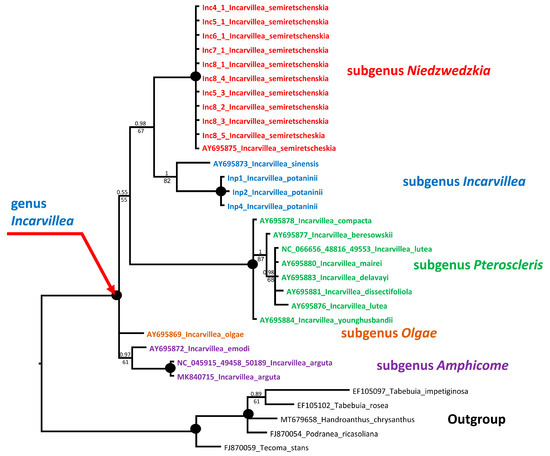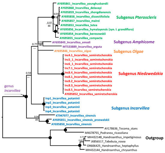 nrITS analysis: We sequenced ITS with 10 accessions of I. semiretschenskia and 4 accessions of I. potaninii. All sequences within a species are identical. The ITS alignment of 35 accessions, including 16 Incarvillea sequences from GenBank and 6 accessions as the outgroup, is 605 bp long (see Supplementary File S1A). In these sequences, 443 characters were constant, 44 variable characters were parsimony-uninformative, and 118 were parsimony-informative. Unweighted parsimony analysis resulted in one most parsimonious tree of 308 steps (CI = 0.6883; RI = 0.8879). The substitution model HKY + G was chosen according to the AIC in jModelTest2 v.2.1.6 for the Bayesian analysis (Figure 4). Incarvillea is monophyletic, and the I. sinensis accessions (subgen. Incarvillea) form a basal clade in the genus with medium support (0.94 PP and 89 BS). I. potaninii accessions (subgen. Incarvillea) also form a clear monophyletic clade and the sister clade to I. sinensis, leaving the subgenus Incarvillea as weakly monophyletic. All remaining subgenera form unresolved clades with monophyletic clades with varying levels of support: subgenera Pteroscleris and Niedzwedzkia have very strong support, and subgenera Amphicome and Olgae are weakly supported or unresolved. This may be due to only one accession sequence existing for one species. Interestingly, the ITS tree topology differs in Bayesian, maximum likelihood, and maximum parsimony. In the maximum likelihood and maximum parsimony trees, I. semiretschenskia is sister to all other Incarvillea species, and the subgenus Incarvillea is more clearly paraphyletic than in the Bayesian tree. It should also be noted that support for separating the clade containing I. semiretschenskia from other species of the genus in the maximum likelihood tree is minimal (51%) (Figure S1).