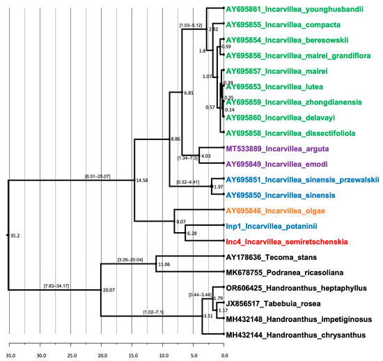 Our divergence time estimation analyses of the genus Incarvillea (Figure 7) generated a slightly different to the nrITS topology, compared to the Bayesian inference analysis (Figure 4), but corresponded to the maximum likelihood tree (Figure S1). According to the analyzed taxon sets, consisting of only one accession for each taxon, the genus Incarvillea underwent significant diversification. It diversified from the genera in the tribe Tecomeae of the Bignoniaceae family around 35.7 million years ago (mya) in the middle Eocene. The first diversification within the genus Incarvillea into two sister clades, A, which includes only three north-distributed Incarvillea species—I. semiretschenskia, I. potaninii, and I. olgae—and B, which includes all other species of the genus Incarvillea, occurred only in the middle Miocene (14.58 Mya), providing a clear and engaging timeline of the genus’s evolution. I. semiretschenskia and I. potaninii are sister taxa that diverged in the late Miocene (6.28 Mya).