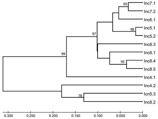 One cluster consists of three accessions from populations A (Inc4.2 and Inc5.3) and B (Inc8.2), and the other cluster combines all remaining accessions examined, with accession Inc4.1 standing somewhat isolated. The PCA of the same fingerprint matrix in the two first analyses (component 1 with component 2 and component 1 with component 3: both constellations explain over 50% of variability) (Figure S3) shows similar results.