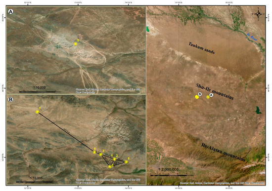 The Shu-Ile low mountains are distinguished by the poorly expressed altitudinal zonality of their landscapes due to differences in slope exposure and steepness, lithological heterogeneity, and fragmentary altitudinal belts of soil cover. This includes desert steppes in the lowlands with the development of mountain light chestnut soils on plateau-like peaks; mountain steppe deserts with light gray, often rubbly soils on undulating foothill plains; and brown desert soils on gentle northern slopes of mountains formed on proluvial, rubbly flint deposits. Bottoms of flat hollows with shallow groundwater (2–3 m) are occupied by meadow soils. Saline soils develop in relief depressions and along dry channels on the outcrops of Tertiary clays. Separately located low mountains are characterized by the formation of gray, crushed, stone mountain soils [14,15].