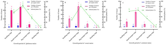 Field damage caused by FAW larvae (A) on glutinous maize, (B) on sweet maize, (C) on common maize. Histograms are expressed as mean ± SD. One-way ANOVA was used to determine differences in field damage caused by FAW larvae (p < 0.05). Post hoc test was used by LSD. Uppercase letters indicate significant differences in the number of insects per 100 plants. Blue lowercase letters indicate significant differences in the number of insects per square meter. Green lowercase letters indicate significant differences in infested plants (%).