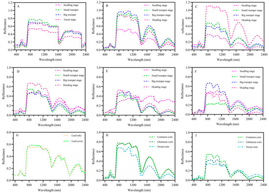 Spectral reflectance of maize leaves and combined leaf/soil. (A) Common maize leaves. (B) Glutinous maize leaves. (C) Sweet maize leaves. (D) Common maize combined leaf/soil. (E) Glutinous maize combined leaf/soil. (F) Sweet maize combined leaf/soil. (G) Leaf only and leaf cover (mimics). (H) Maize leaves at small trumpet stage. (I) Combined leaf/soil at small trumpet stage. A chi-squared test (L-R X2 degrees of freedom = 1) was used to detect significant differences between the leaf reflectance spectra of leaf only and leaf cover.