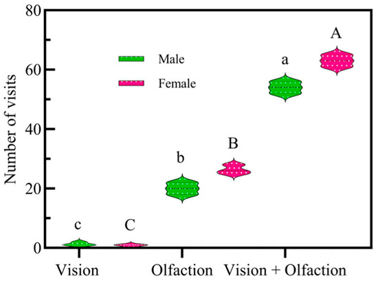During the host recognition process, the integrated use of vision and olfaction resulted in the highest visit frequency, with the number of visits being 63 times (53.85%) for females and 54 times (46.15%) for males (Figure 3). The visit frequency for olfaction was much higher than for vision (F = 1.73, df = 4, p < 0.01), indicating that olfaction plays a dominant role. The visitation frequency of male adults with combined vision and olfaction was 29.83 times that of single vision, and that of females was 98.43 times. The visitation frequency of male adults with combined vision and olfaction was 2.7 times that of single olfaction, and that of females was 2.42 times.