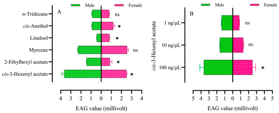 EAG responses of adult FAWs to host plant VOCs: (A) to different VOCs at a concentration of 100 μg/μL; (B) to different concentrations of cis-3-hexenyl acetate. Histograms are expressed as mean ± SD. Differential EAG values between female and male adult FAWs were analyzed by t-test. * indicates statistically significant differences (p < 0.05) in EAG values between males and females. ns indicates no significant differences (p > 0.05) in EAG values between males and females.