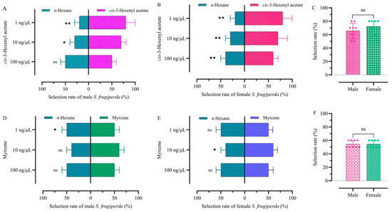 Selection rate of FAWs to maize leaf VOCs. (A) Males to cis-3-hexenyl acetate. (B) Females to cis-3-hexenyl acetate. (C) Comparison of selection rates to cis-3-hexenyl acetate. (D) Males to myrcene. (E) Females to myrcene. Histograms are expressed as mean ± SD. (F) Comparison of selection rates to myrcene. Selection rate between female and male adults was analyzed by t-test. * indicates statistically significant differences (p < 0.05). ** indicates statistically significant differences (p < 0.01). ns indicates no significant differences.